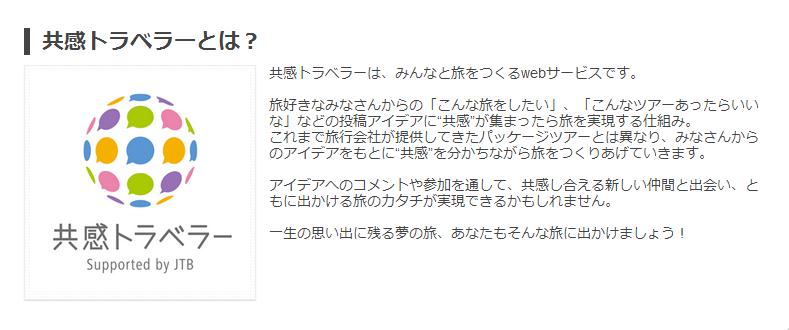 「共感トラベラー」は、ユーザーが発案した旅行アイデアを、PC・スマートフォン専用サイト上に書き込み、アイデアに共感する閲覧者とともにサイト上で旅行プランを具体化していき、一定数の参加希望が集まると、JTBが旅行商品化をするというサービス。